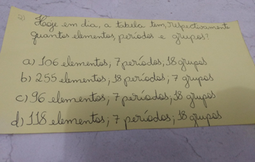1º jogo das adivinhas - os alunos deste grupo devem escrever em fichas perguntas sobre a tabela periódica(do conteúdo ministrado em sala) com alternativas definidas em letras, sendo: a), b), c), d). O jogo segue as rodadas de 10 perguntas no total, com um aluno/ou aluna do grupo questionando e outro de grupo distinto respondendo. Ganha o jogador/aluno que acertar mais perguntas no final de todas as rodadas.