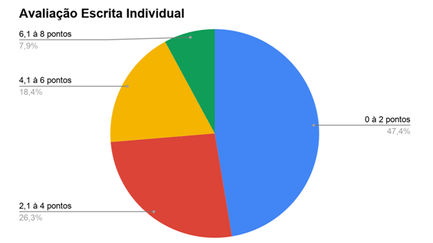 Comparando a porcentagem dos gráficos acima, podemos observar no gráfico 1 que 47,4% dos alunos tiveram nota inferior a 2 pontos na avaliação escrita individual sobre o conteúdo. Já, no segundo gráfico, este cenário muda, de acordo, com a aprendizagem dos alunos utilizando os jogos químicos, apresentando no gráfico 2 que 58,3% obtiveram nota superior a 8,1 pontos. Percebe-se uma nítida diferença entre o ensino tradicional, em que o professor deposita o conhecimento sobre o aluno e o ensino lúdico, em que o aluno se transforma em o detentor do seu próprio conhecimento. Com os resultados apresentados podemos concluir que os jogos didáticos mostraram ser uma excelente alternativa como um elemento facilitador da aprendizagem. Com a utilização do jogo foi possível motivar a aprendizagem o que facilitou a aquisição do conhecimento e a correlação deste com o cotidiano do aluno. Além de obter melhores resultados no processo de ensino aprendizagem, a utilização do jogo também promoveu a socialização e atuou sobre problemas disciplinares atingindo assim todos os objetivos propostos.