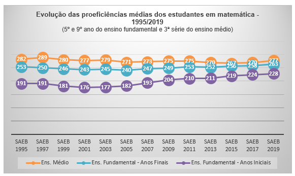 De acordo com o gráfico e a declaração de Ernesto Farias para a revista Nova Escola mostram que todas as etapas de ensino obtiveram avanços, mas se considerar que para se ter um nível adequado de aprendizagem em matemática, o 9º ano do ensino fundamental deve atingir a pontuação mínima de 300 pontos. Contata-se uma alarmante estatística, pois, em nenhum dos anos desde que o Saeb foi criado em 1995 esse nível de pontuação foi atingida. Do ponto de vista pedagógico, esse cenário mostra que pelos números da etapa do ensino médio, onde os alunos concluem a educação básica para iniciar seus estudos superiores, a maioria dos estudantes não são capazes de solucionar problemas com operações fundamentais com números naturais ou até mesmo reconhecer um gráfico a partir de um texto.