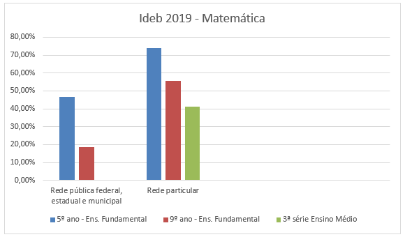 A revista Nova Escola (2020) demostra um gráfico com a porcentagem de alunos com aprendizagem considerada adequada para cada etapa de ensino no Brasil baseando-se nas notas do Ideb 2019: