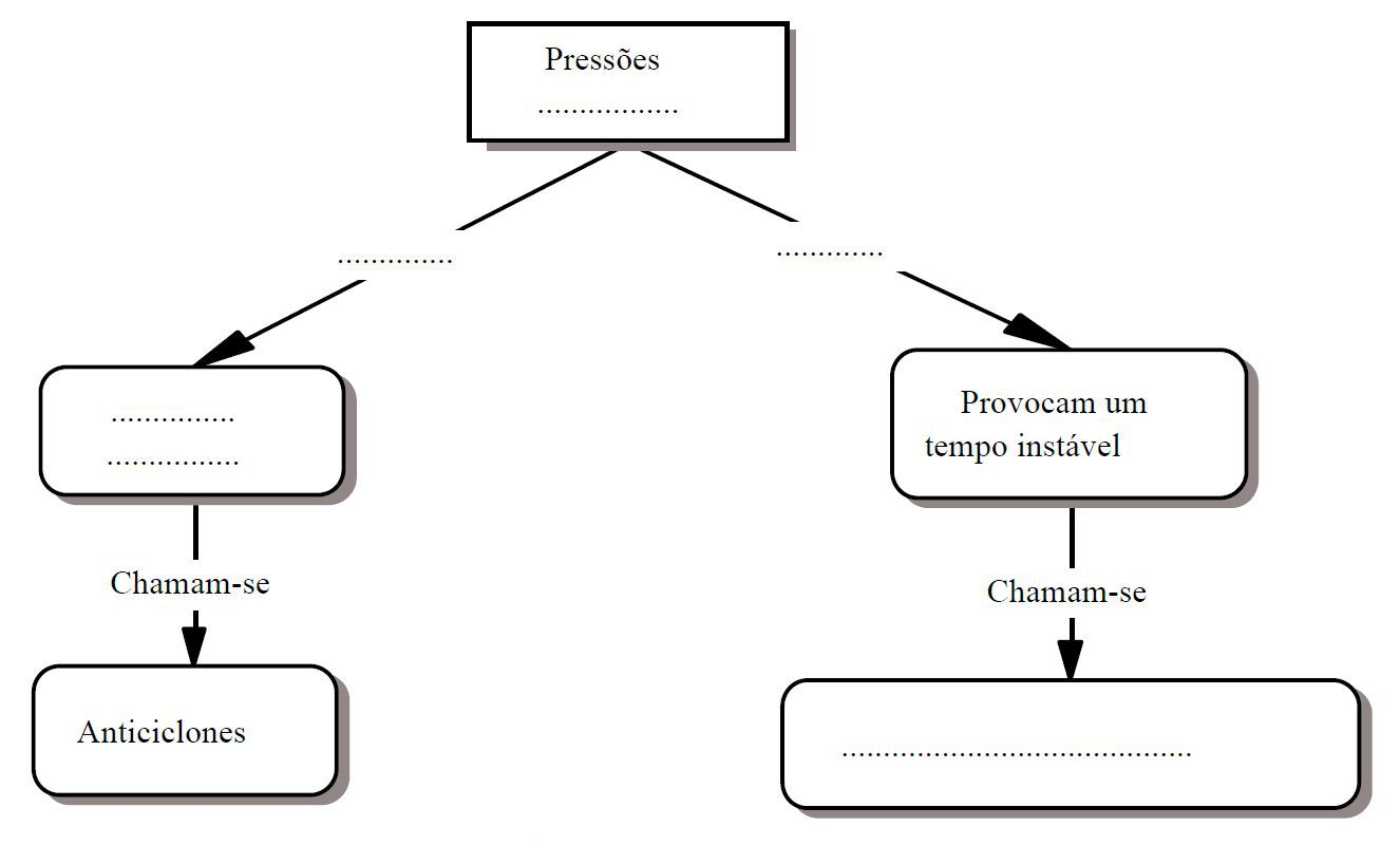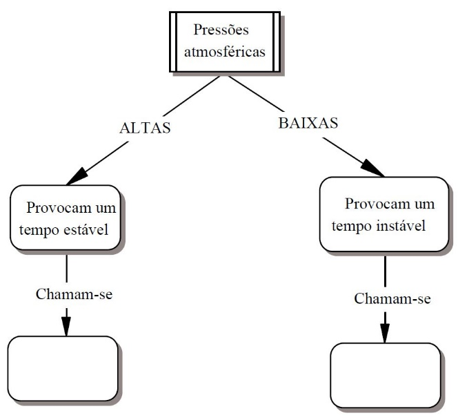 (P) “...quando as pressões atmosféricas são altas, o tempo é mais estável; estas zonas recebem um nome concreto que, como podem ver no esquema, não temos; há alguém que saiba?” (A) “chamam-se depressões” (P) ...depressões...quando uma pessoa está deprimida é porque tem o ânimo baixo ou alto?” (A) “baixo” (P) “então, o conceito de depressão deveremos empregá-lo para definir zonas atmosféricas com pressões...?” (A) “baixas” (P) “Onde colocaria esse conceito em nosso esquema?” (A) “no círculo vazio da direita, junto à flecha que vem de <provoca um tempo instável>”. |
