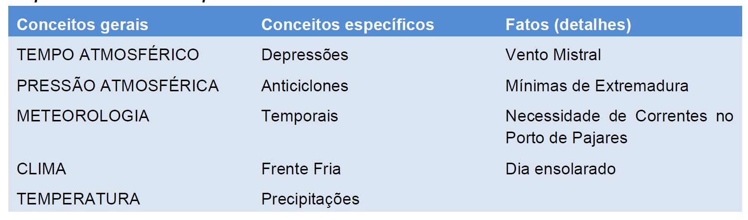 Quinto: A seguir, vou dividi-los em grupos de três (misturar nos grupos alunos de alto e baixo rendimento) e quero que introduzam no mapa estes novos conceitos: TEMPERATURA, BORRASCAS e DIA ENSOLARADO. Não se esqueçam de escrever as palavras que ligam dois conceitos. Em seguida, deverão argumentar vossas decisões.