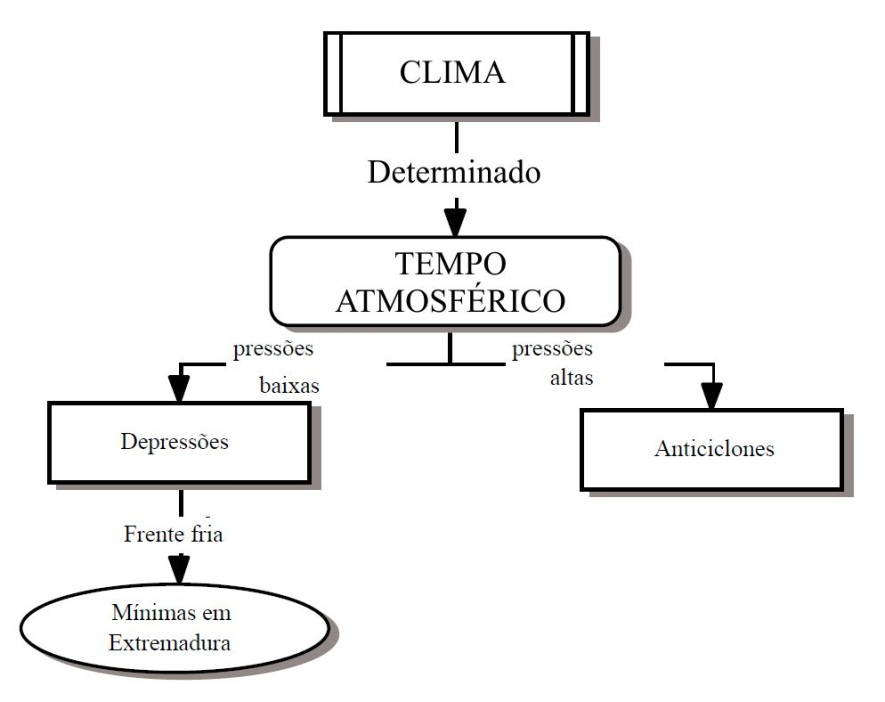 Planejou com muito cuidado a aula, a partir de uma rede de conceitos que dispôs em uma transparência. Em uma aula prévia, fez algumas perguntas sobre o tema, identificando algumas noções relevantes como, por exemplo, anticiclone, depressão ou isóbara, que eram confusas, quando não erradas. Precisamente, na representação que fez, faltam estes conteúdos. Ao começar a sessão, explica cada uma das ramificações e quando chega a um "conceito vazio" para e inicia um diálogo com os alunos, tal como se pode ver seguidamente. Ao finalizar a unidade didática, e para avaliar seus alunos, apresenta uma rede de conceitos similar à trabalhada em aula e pede-lhes que a completem, tal como se apresenta a seguir.