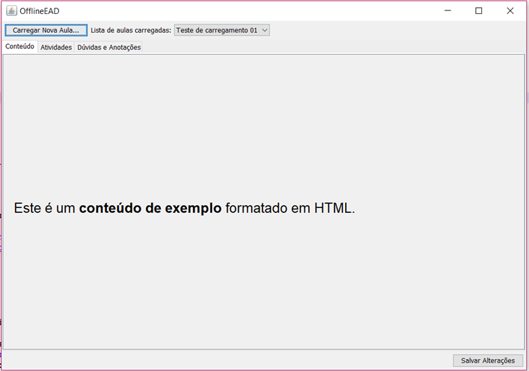 A interface gráfica do programa é dividida três painéis principais. O primeiro contém os botões de controle, e fica na parte superior. É formado por um botão “Carregar Nova Aula” que permite procurar e carregar uma aula no programa e uma lista de itens (objeto do tipo JComboBox) que permite ao usuário selecionar uma entre as aulas já carregadas para exibição. O segundo painel, que ocupa a parte central da tela, é o painel principal onde a aula será exibida e ocupa a maior parte da interface do programa. Ele é formado por três abas: a primeira é a aba Conteúdo, que mostra o conteúdo em HTML da aula selecionada, a segunda é a aba de Atividades, com todas as atividades listadas no XML da aula, e a terceira aba é a de Dúvidas e Anotações. O terceiro e último painel, na parte inferior, contém apenas um botão “Salvar Alterações”, utilizado para salvar as alterações realizadas pelo aluno (respostas de atividades, dúvidas e anotações) no XML da aula selecionada.