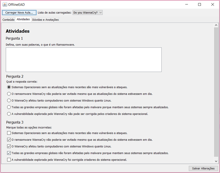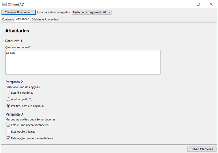 O aluno deve digitar, no campo de texto, a resposta ao enunciado da pergunta. Quando o aluno clicar no botão “Salvar Alterações”, o texto digitado será salvo no XML, e será carregada no mesmo toda vez que a aula for carregada no programa.