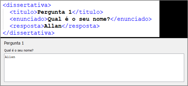 O painel gráfico que a representa consiste de duas labels (JLabel) para título e enunciado e um campo de texto (JTextArea) para a resposta. A mostra lado a lado o código XML e o painel gráfico resultante.