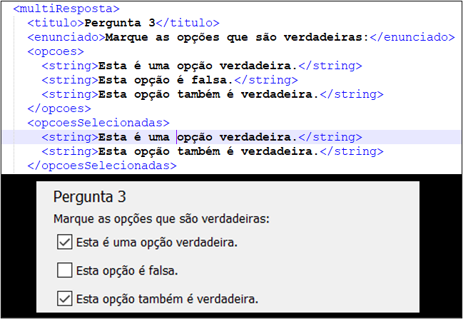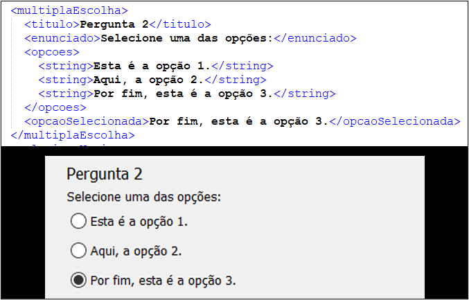 Figura - Exemplo de atividade de múltipla escolha e código XML