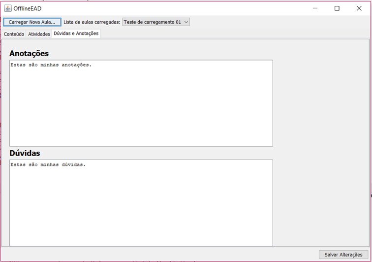 A interface gráfica desta aba contém apenas dois campos de texto, um dedicado a anotações e outro às dúvidas, como mostrado na . Quando a aula é carregada, qualquer texto que já esteja salvo no arquivo XML é carregado em seus respectivos campos.