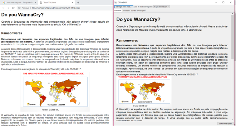 A nos mostra como o conteúdo desenvolvido aparece visualmente dentro do programa, ao lado do mesmo código em HTML mostrado no navegador Google Chrome. Nela, podemos observar que o conteúdo fica dentro de um painel com barras de rolagem (JScrollPane), já que na maioria das vezes o conteúdo a ser mostrado será maior do que a tela do programa. Este mesmo comportamento pode ser observado também nas abas Atividades e Dúvidas e Anotações, caso os dados a serem mostrados sejam maiores do que o espaço de tela disponível.