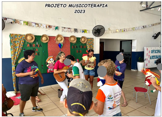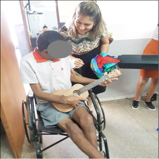 Foram realizadas sessões de Musicoterapia em grupo ou individual, na APAE de Colíder proporcionando aos nossos alunos momentos de alegria e bem-estar, utilizando a música num contexto clínico e terapêutico, para reabilitação, prevenção e promoção da saúde. Esses atendimentos aconteceram mediados por uma profissional habilitada em Musicoterapia, e todos os registros apresentados a seguir são autorizados pela Instituição e pelos familiares.