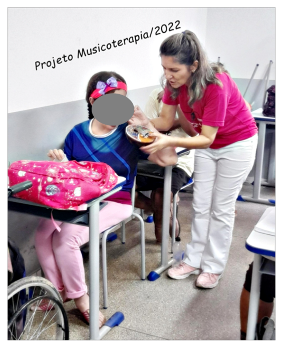 A Musicoterapia é uma ciência voltada para o comportamento e o desenvolvimento do ser humano. Sua atuação dá-se não somente em aspectos reabilitativos, mas também no desenvolvimento de habilidades do indivíduo com necessidades especiais. Um diagnóstico comumente encontrado nas escolas é o atraso do desenvolvimento, definido como um grupo de disfunções com distúrbios essencialmente predominantes na aquisição de competências cognitivas, linguagem, motoras ou psicossociais. Inclui os seguintes diagnósticos: retardo mental, distúrbios específicos do desenvolvimento, transtornos do desenvolvimento e distúrbios de comportamento. Além de proporcionar sensação de bem-estar, a música quando usada como terapia, pode trazer benefícios para a saúde como melhorar o humor, a concentração e o raciocínio lógico. A musicoterapia é uma boa opção para crianças se desenvolverem melhor, tendo uma maior capacidade de aprendizagem. A musicoterapia é uma terapia que utiliza a música no seu contexto clínico como método terapêutico visando à melhora dos problemas do indivíduo. Através do uso da musicoterapia em uma instituição de Educação Especial, acredita-se que o processo realizado com os pacientes é eficaz na socialização dos sujeitos envolvidos no processo, visando à inclusão e participação do indivíduo, proporcionando-lhe um espaço de confiança mútua cujo objetivo no final do processo é a melhora da autoestima, despertando assim desejos e estimulando suas potencialidades. Neste sentido, a musicoterapia trabalha o processo terapêutico favorecendo a minimização das problemáticas do processo inclusivo, fazendo com que este processo se torne mais saudável para o indivíduo e seu grupo social. Portanto, a musicoterapia com educandos participantes da inclusão escolar e de atendimentos educacionais especializados auxilia na promoção da saúde individual e coletiva.