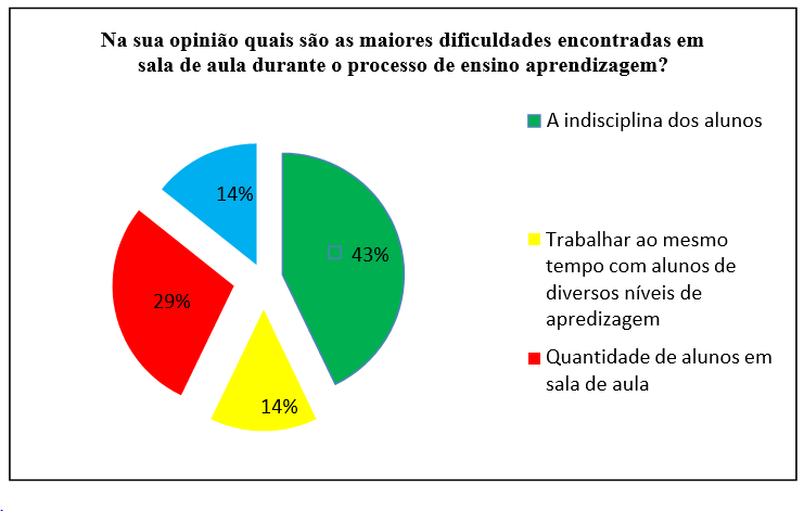 Desta forma o primeiro questionamento aos professores da escola Fábio Ribeiro da Cruz buscou saber dos profissionais quais são as maiores dificuldades encontrada em sala de aula durante o processo de ensino aprendizagem. Como se observa no gráfico 43% dos entrevistados respondeu que a maior dificuldade é a indisciplina dos alunos, 29% disseram que a quantidade de alunos em sala de aula prejudica no processo de ensino aprendizagem, 14% responderam que trabalhar ao mesmo tempo com alunos de diversos níveis de aprendizagem, sendo que 14% não opinaram.