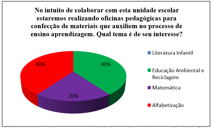 Com base na proposta analisou-se que 40% tem interesse em oficinas que auxiliam na alfabetização e também na educação ambiental e reciclagem e 20% interessou-se por receber apoio pedagógico em matemática.
