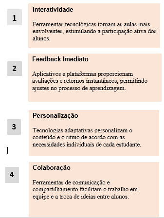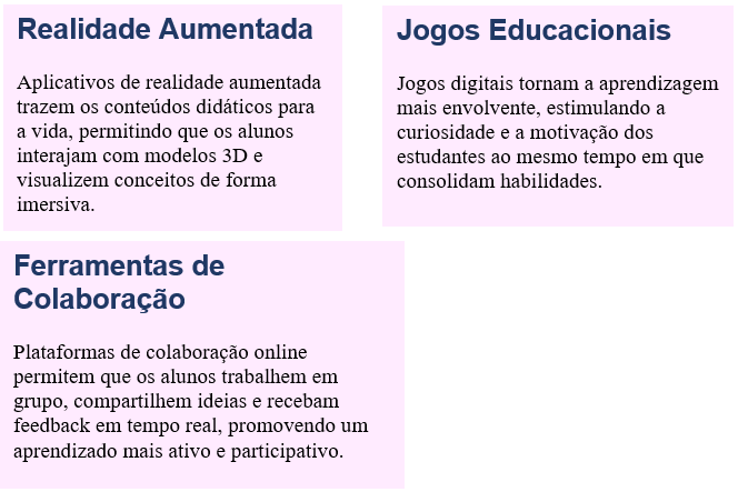 A tecnologia digital está transformando a forma como os estudantes aprendem e os educadores ensinam. Com uma ampla gama de ferramentas e recursos, a tecnologia se torna uma aliada poderosa para uma educação mais envolvente e eficaz. Aplicativos de realidade aumentada trazem os conteúdos didáticos para a vida, permitindo que os alunos interajam com modelos 3D e visualizem conceitos de forma imersiva. Jogos digitais tornam a aprendizagem mais envolvente, estimulando a curiosidade e a motivação dos estudantes ao mesmo tempo em que consolidam habilidades. Ferramentas de Colaboração Plataformas de colaboração online permitem que os alunos trabalhem em grupo, compartilhem ideias e recebam feedback em tempo real, promovendo um aprendizado mais ativo e participativo. A tecnologia está redefinindo a forma como aprendemos e ensinamos. Uma vez vista como uma distração, ela se tornou uma ferramenta indispensável para enriquecer o processo educacional. Cada aluno tem seu próprio ritmo e estilo de aprendizado. As ferramentas digitais permitem criar experiências de aprendizado personalizadas, adaptando-se às necessidades individuais. A internet coloca uma vasta quantidade de informação ao alcance de todos, permitindo que os alunos explorem temas de interesse e aprofundem seus conhecimentos. Plataformas online facilitam a colaboração entre alunos e professores, promovendo a troca de ideias e o trabalho em equipe. Jogos educativos, simulações e outras ferramentas interativas tornam o aprendizado mais divertido e envolvente. A tecnologia permite que os alunos aprendam a qualquer hora e em qualquer lugar, oferecendo maior flexibilidade. Ferramentas como Google Classroom, Moodle e Canvas permitem a criação de cursos online, a realização de atividades e a comunicação entre alunos e professores. Existem diversos aplicativos para dispositivos móveis que ensinam matemática, línguas, história e outras disciplinas de forma divertida e interativa. Essas tecnologias imersivas oferecem novas possibilidades para a visualização de conceitos complexos e a realização de experiências práticas. Algoritmos de IA podem personalizar o aprendizado, identificar dificuldades dos alunos e oferecer suporte individualizado. Apesar dos benefícios e oportunidades, a integração da tecnologia na educação também apresenta desafios: Nem todos os alunos têm acesso à internet e a dispositivos digitais de qualidade. Muitos professores precisam de treinamento para utilizar as ferramentas digitais de forma eficaz. O uso excessivo de dispositivos pode levar à distração e à perda de foco.