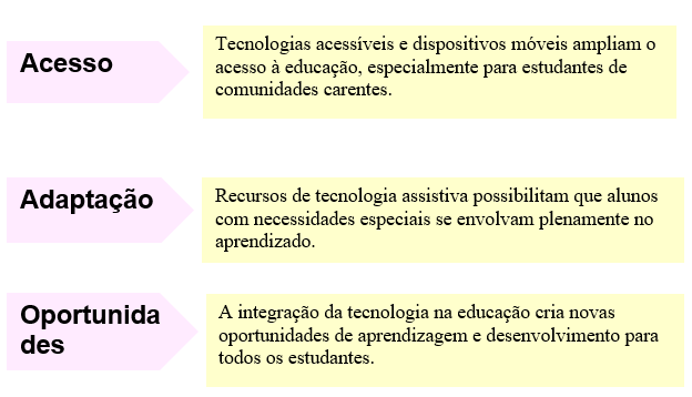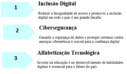 E la traz inúmeras vantagens, como a facilidade na comunicação, melhoria na qualidade de vida e aumento da produtividade. No entanto, também pode ter um impacto negativo, como o aumento da dependência digital, a disseminação de informações falsas e a ameaça a privacidade dos indivíduos. Atualmente, as conseqüências da exclusão social acentuam a desigualdade tecnológica e dificultam o acesso ao conhecimento, aumentando o abismo entre ricos e pobres. Isso se deve, em grande parte, ao fator renda (SPAGNOLO, 2003). O retrato da exclusão digital na sociedade brasileira A exclusão digital vem ganhando destaque nos últimos anos. As atenções começam a se voltar para este assunto, que já é visto como causa e consequência da exclusão em nossa sociedade. O Brasil é palco de desigualdades que criam uma demanda por políticas de transferência e geração de renda. Porém, não basta disponibilizar os meios; é importante mostrar às pessoas como as tecnologias podem contribuir para suas tarefas e atividades, trazendo conhecimento e novas oportunidades. Este trabalho, baseado em pesquisa bibliográfica reflexiva e qualitativa, aborda aspectos que estão normalmente associados com a exclusão digital, como a exclusão social, a sociedade do conhecimento, o e-gov e a economia contemporânea, dentre outros, além de fatores que devem ser levados em consideração para elaboração de políticas de combate à exclusão digital. Como resultado desta reflexão, identificam-se algumas das reais consequências e o significado da exclusão digital na sociedade brasileira. O fator motivador deste trabalho foi a observação dos impactos que a tecnologia da informação exerce sobre o trabalho e a vida dos cidadãos brasileiros. Podendo observar que essa facilidade gera benefícios imediatos, como a agilidade nas comunicações e um maior acesso à informação. Além disso, há também o aumento na movimentação da economia e nos hábitos de consumo, com produtos digitais a preços mais acessíveis e maior variedade de ofertas. As TIC (Tecnologias da Informação e a Comunicação) oferecem inúmeras vantagens: mais acesso à informação, redução de custos no setor trabalhista, mais conectividade entre as pessoas, etc. Porém, a digitalização não está acontecendo de forma igualitária em todo o mundo. Também existe um desequilíbrio e o nome para isto é exclusão digital. O estudo aponta que o abismo digital no Brasil pode ter consequências graves para o futuro do país. A falta de acesso à internet pode limitar o desenvolvimento econômico e social do país, além de aumentar as desigualdades sociais. Para superar a desigualdade digital na educação, é necessário um esforço conjunto de governos, escolas, empresas e sociedade civil. Algumas medidas que podem ser adotadas incluem: Expansão do acesso à internet: Investimento em infraestrutura para levar a internet a todas as escolas e comunidades. Doação de equipamentos: Campanhas de doação de computadores e tablets para escolas e estudantes carentes. Programas de formação: Oferecimento de cursos de formação para professores e estudantes, visando desenvolver habilidades digitais. Criação de políticas públicas: Implementação de políticas públicas que incentivem o uso da tecnologia na educação e garantam o acesso equitativo a todos os estudantes. Parcerias com empresas: Estabelecimento de parcerias com empresas de tecnologia para o desenvolvimento de soluções educacionais acessíveis e eficazes. Ao enfrentar os desafios da desigualdade digital, é possível garantir que todos os estudantes tenham acesso a uma educação de qualidade e as mesmas oportunidades de desenvolvimento.