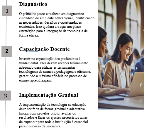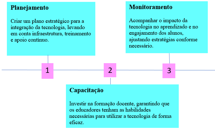 Para superar esses desafios e aproveitar ao máximo o potencial da tecnologia na educação, é fundamental: Investir em infraestrutura - Garantir acesso à internet e dispositivos digitais para todos os alunos. Oferecer formação contínua aos professores - Capacitar os professores para utilizar as ferramentas digitais de forma pedagógica. Desenvolver projetos colaborativos - Envolver alunos, professores e comunidade em projetos que integrem a tecnologia ao currículo escolar.