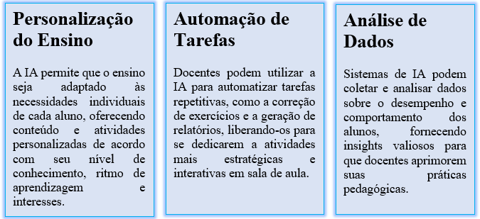 Para os discentes, a inteligência artificial também traz diversas oportunidades de aprendizagem e desenvolvimento. Com o uso de ferramentas de IA, os alunos podem se beneficiar de um processo de ensino mais personalizado, recebendo conteúdo e atividades adaptados às suas necessidades individuais. Além disso, a IA pode oferecer recursos de apoio à aprendizagem, como assistentes virtuais, tutores digitais e sistemas de recomendação, que auxiliam os alunos no estudo e na resolução de problemas. Essas ferramentas têm o potencial de tornar a experiência de aprendizagem mais engajadora, interativa e eficaz.