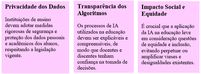 Embora a inteligência artificial ofereça diversas oportunidades na educação, é fundamental que seu uso seja pautado por princípios éticos e de proteção de dados. Docentes e instituições de ensino devem estar atentas aos desafios relacionados à privacidade e à transparência dos algoritmos utilizados. É importante estabelecer políticas claras sobre a coleta, armazenamento e utilização de dados dos alunos, garantindo que estes sejam tratados de forma ética e segura. Além disso, é necessário que os processos de IA sejam transparentes e compreensíveis, de modo que docentes e discentes possam entender como as decisões são tomadas e os resultados são gerados.