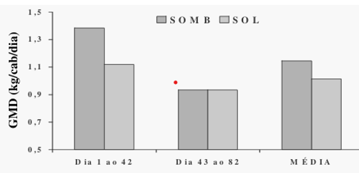 De acordo com o gráfico de Quintiliano e Costa (2007) no período inicial (Dia 1 a 42), foi observado que os animais mantidos sob sombra apresentaram um ganho médio diário (GMD) superior, cerca de 1,35 kg por cabeça por dia, em comparação aos animais expostos ao sol, que registraram aproximadamente 1,1 kg por cabeça por dia. Esse resultado sugere que a presença de sombra contribuiu para um melhor desempenho no ganho de peso diário, possivelmente devido à redução do estresse térmico, um fator importante para a saúde e produtividade dos bovinos de corte.