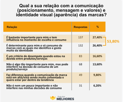 A pesquisa revela que a comunicação, incluindo posicionamento, mensagem e valores, e a identidade visual de uma marca são fatores significativos para 54% dos consumidores. As respostas positivas equivalem aos 27% dos entrevistados que consideram o fator como bastante importante no momento de escolha e de consumo, e aos 26% que pensam que a questão é determinante, sendo que só consomem de marcas com as quais se identificam com a identidade.