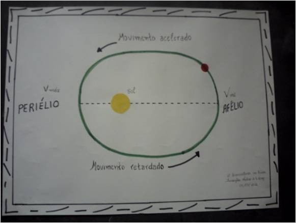 Uma vez realizada a discussão geral sobre o Sistema Solar e seus componentes, foi possível explicar o movimento dos planetas e os pontos periélio e afélio com a utilização do cartaz explicativo. Através da maquete, os estudantes observaram os oito planetas juntamente com seus nomes, foi esclarecido, com auxílio da representação prática, o movimento dos planetas, que todos se movimentam em orbita elíptica de baixa excentricidade em torno do sol, e quando o planeta chega mais próximo do Sol, sua velocidade de movimento aumenta, ou seja, percorre um espaço maior em sua órbita em um certo intervalo de tempo e quando vai se afastando do Sol a velocidade diminui, descrevendo um espaço menor em sua órbita em um intervalo de tempo.