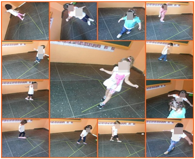 Crianças brincam de andar e equilibrar em cima da letra (A).